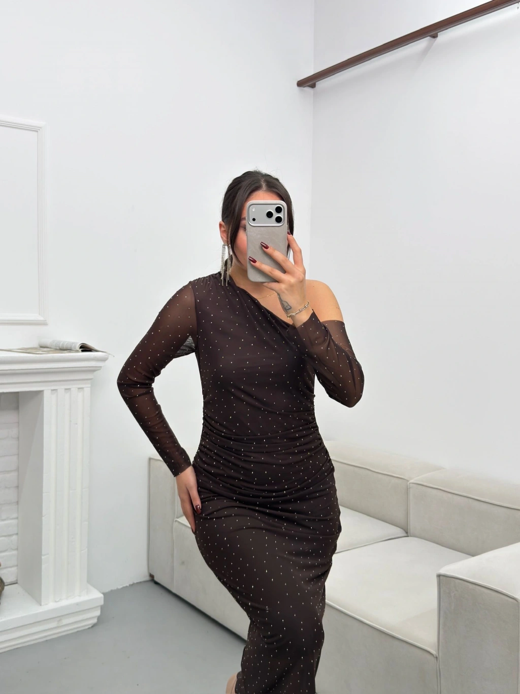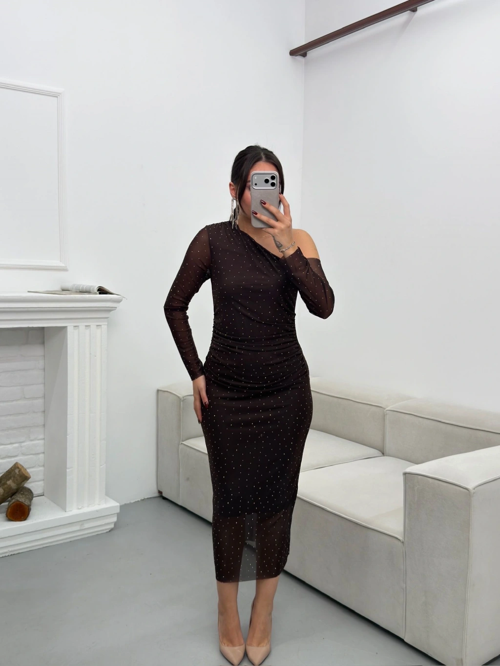 Tek Omuz Taşlı Tül Elbise - KAHVE