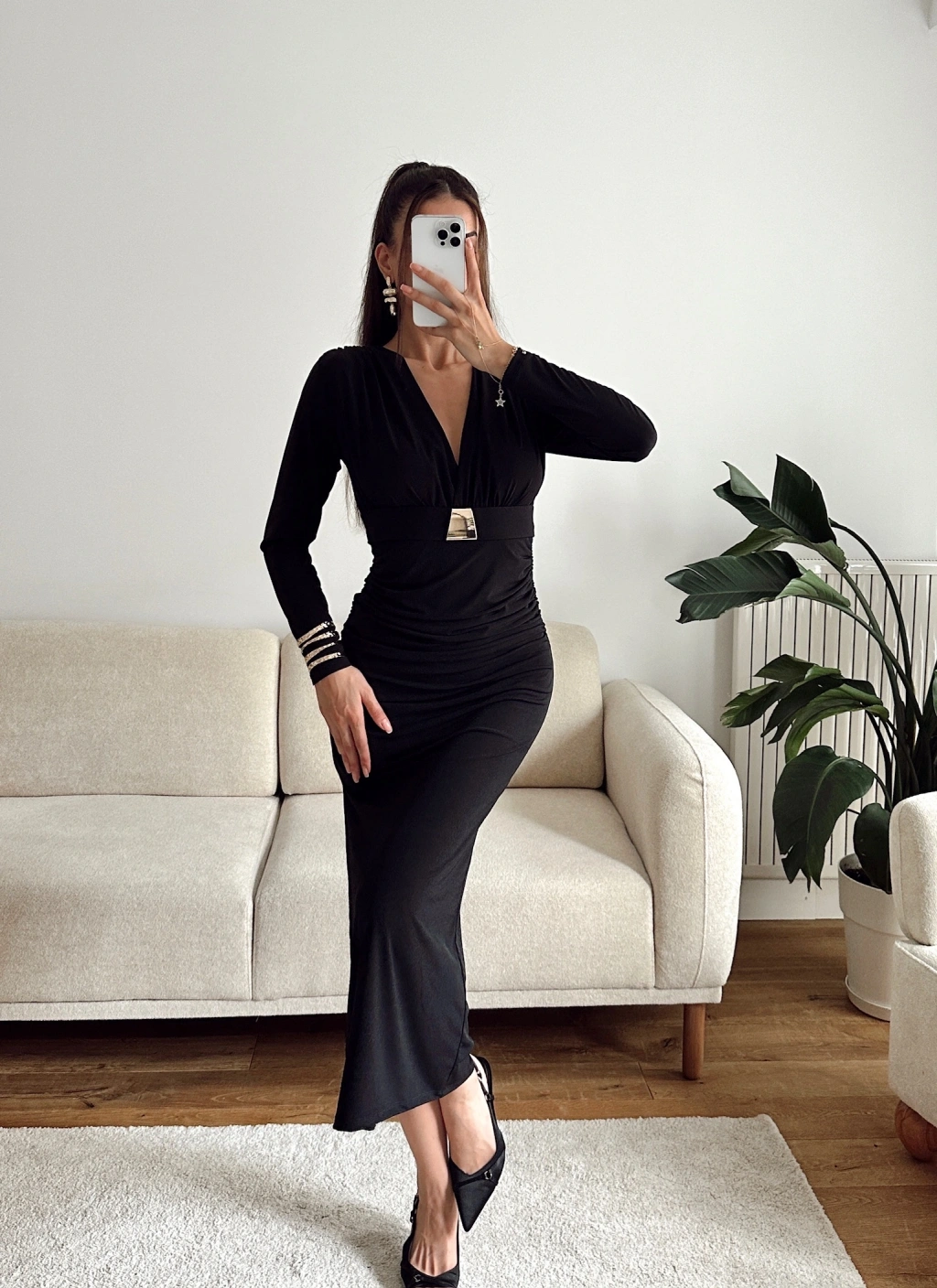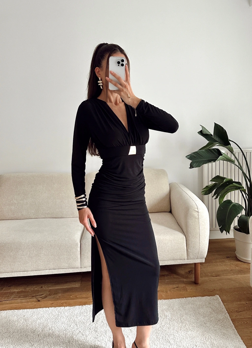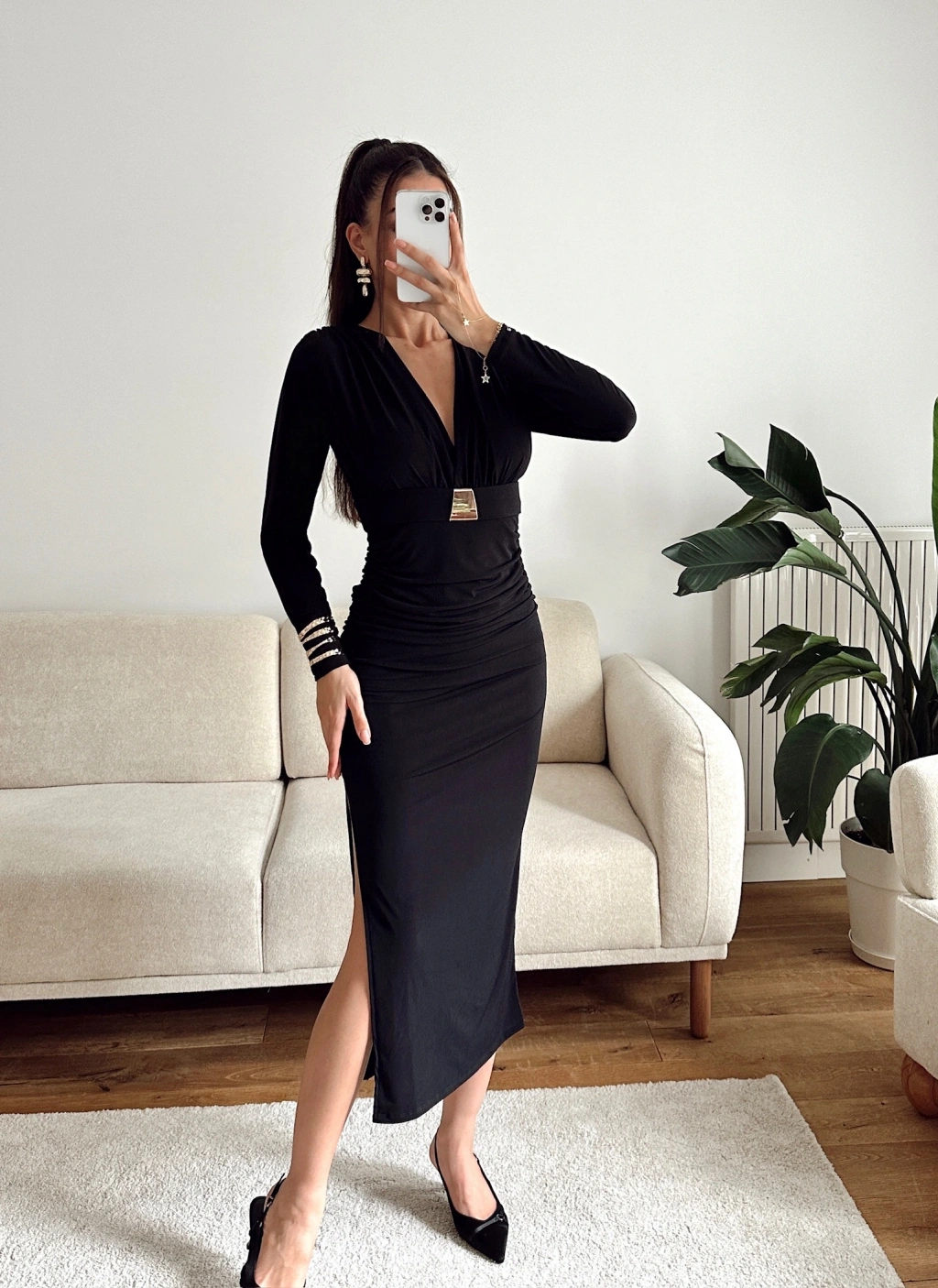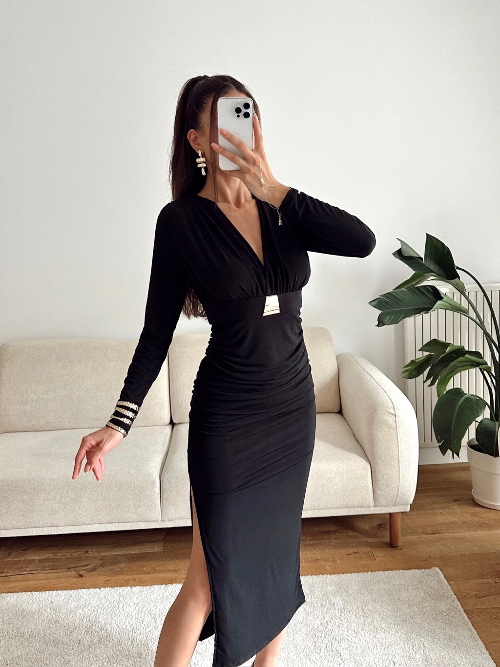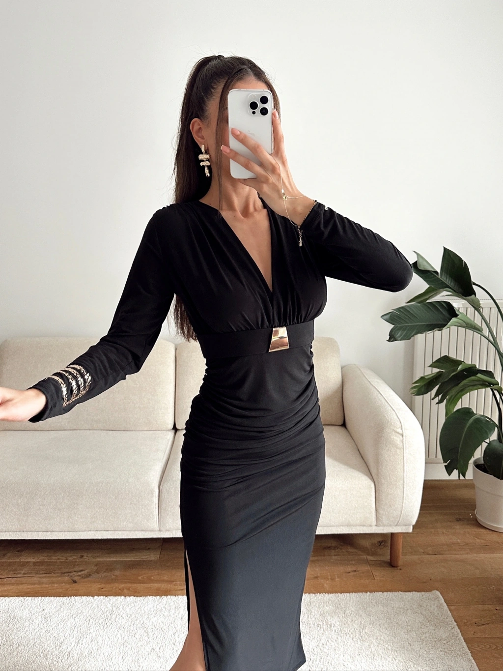 Tokalı V Yaka Yırtmaçlı Elbise - SİYAH