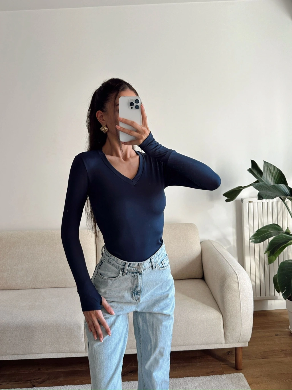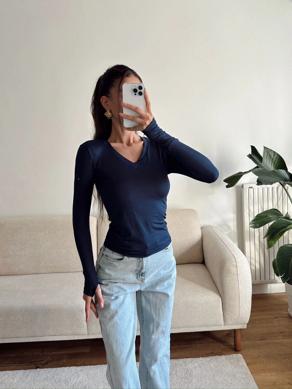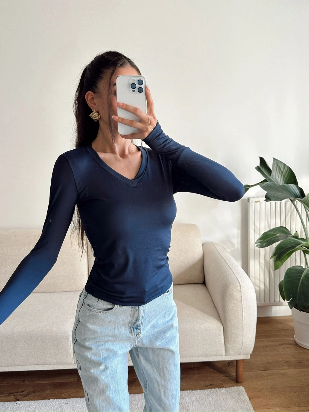 V Yaka Belize Kumaş Crop - LACİVERT