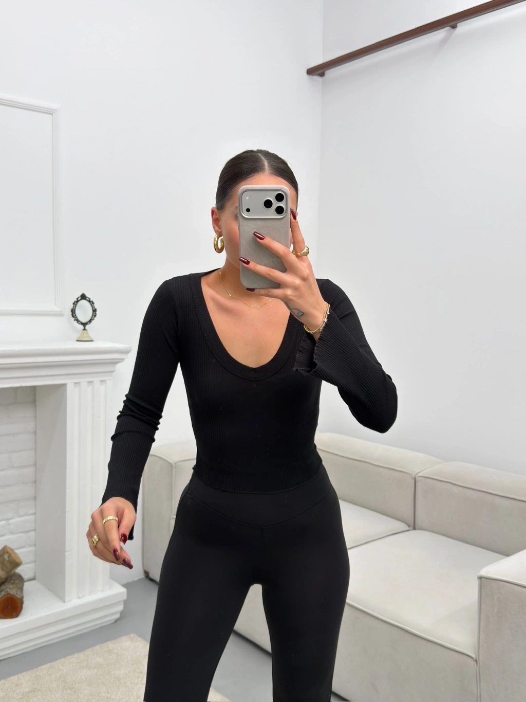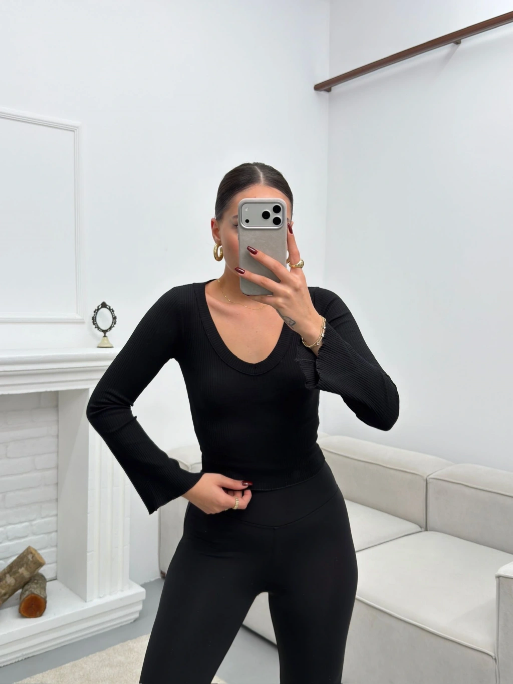 V Yaka Kol İspanyol Crop - SİYAH