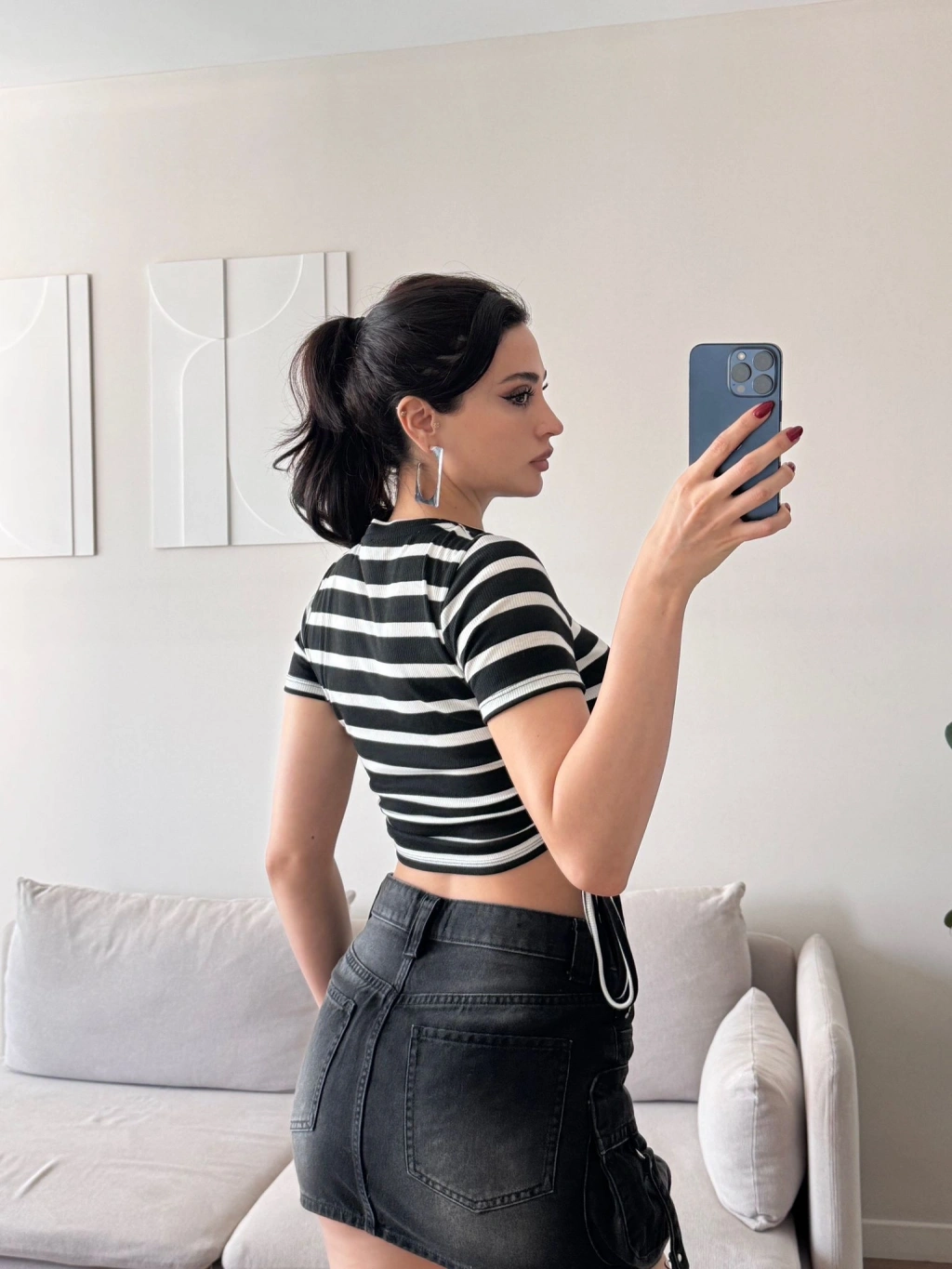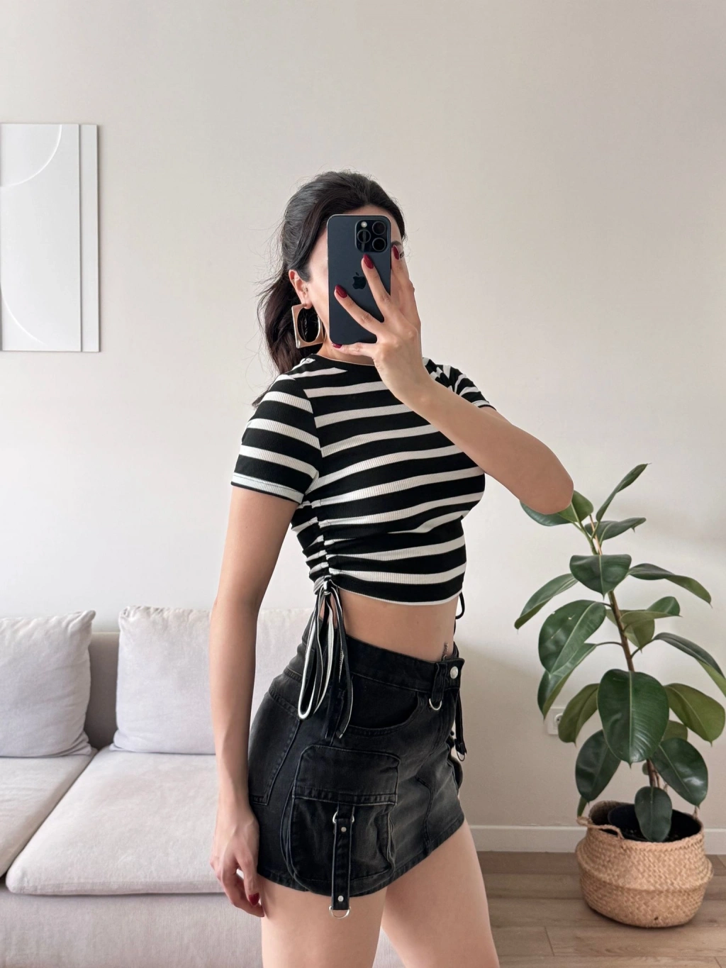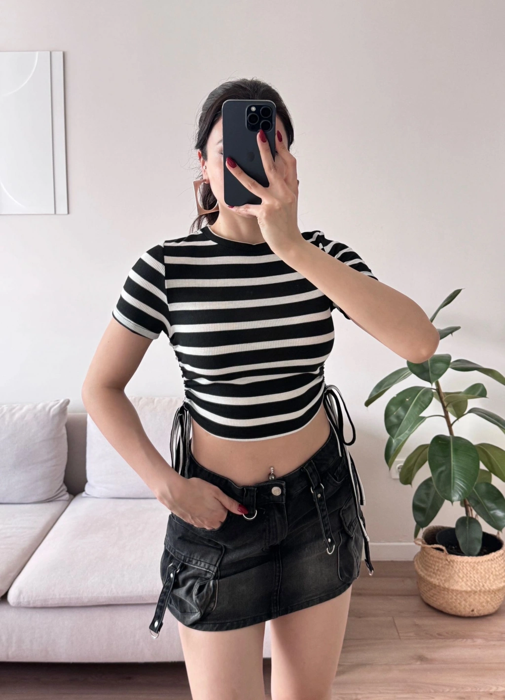 Yan Büzgü Çizgili Crop - SİYAH