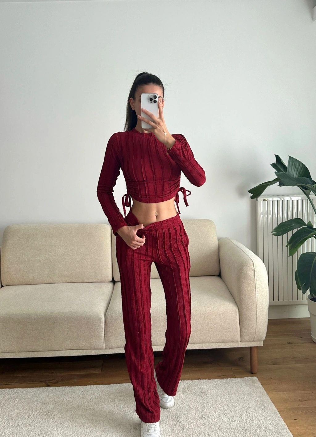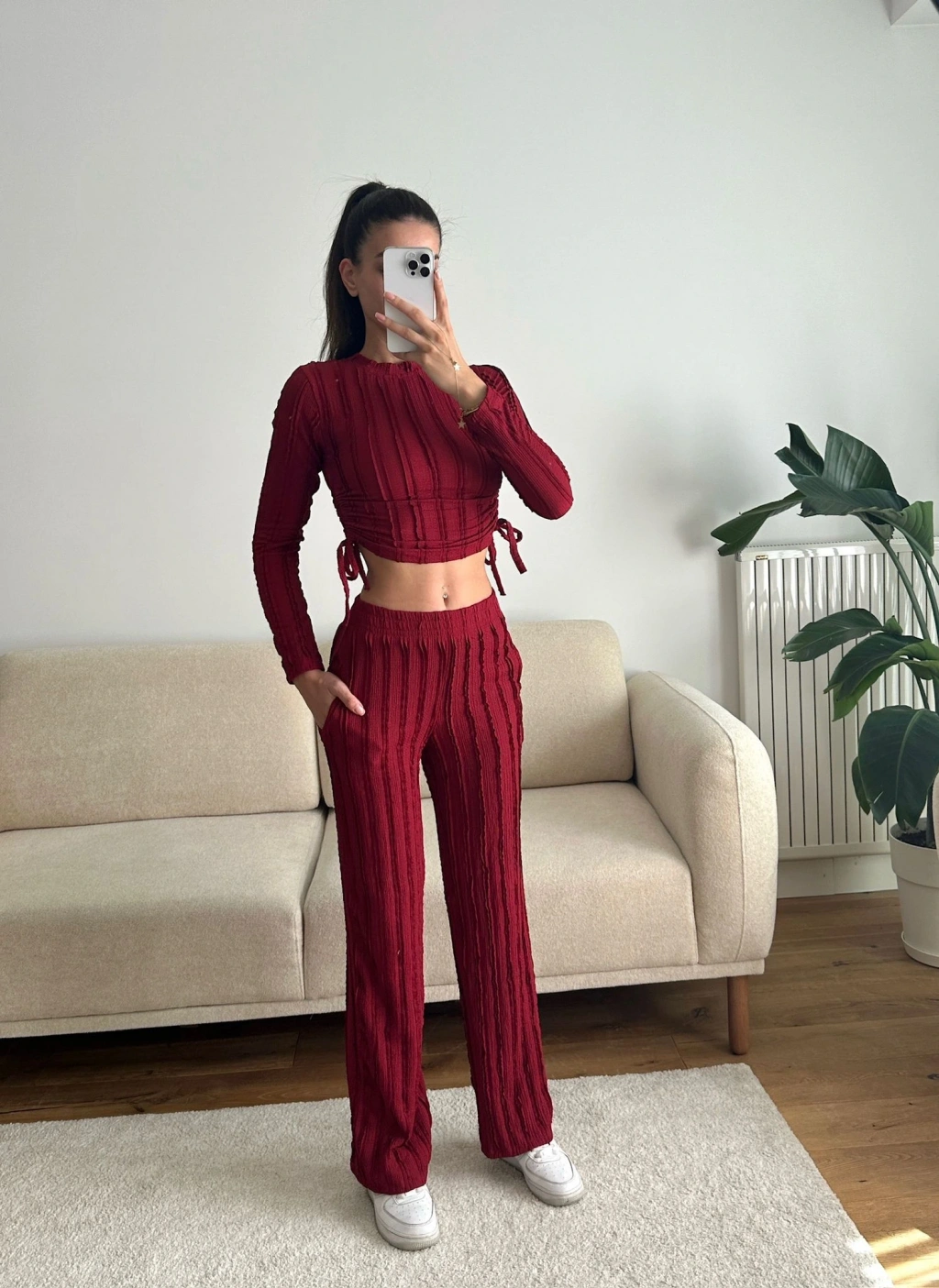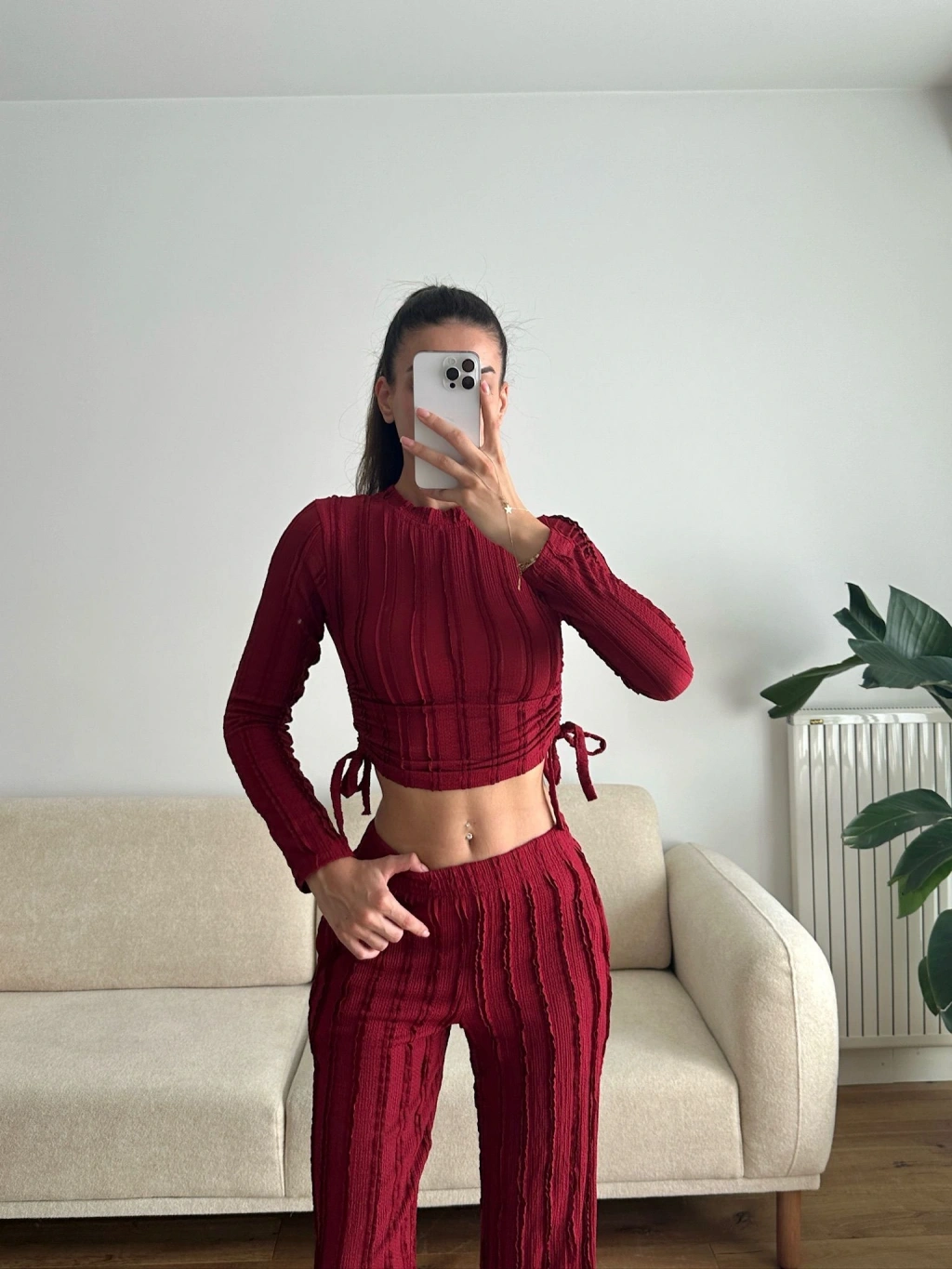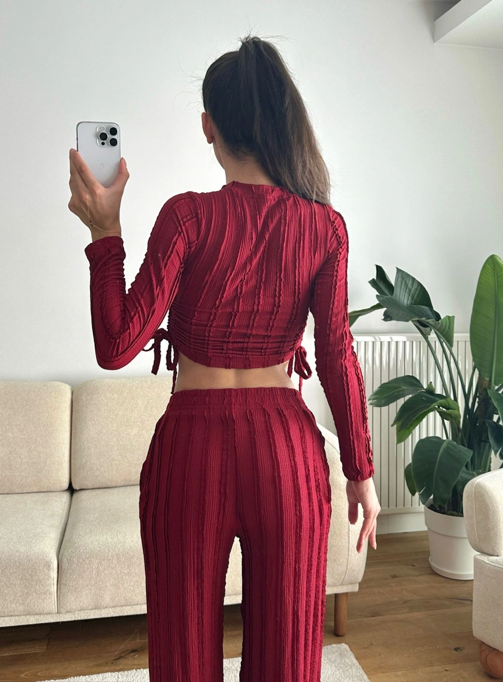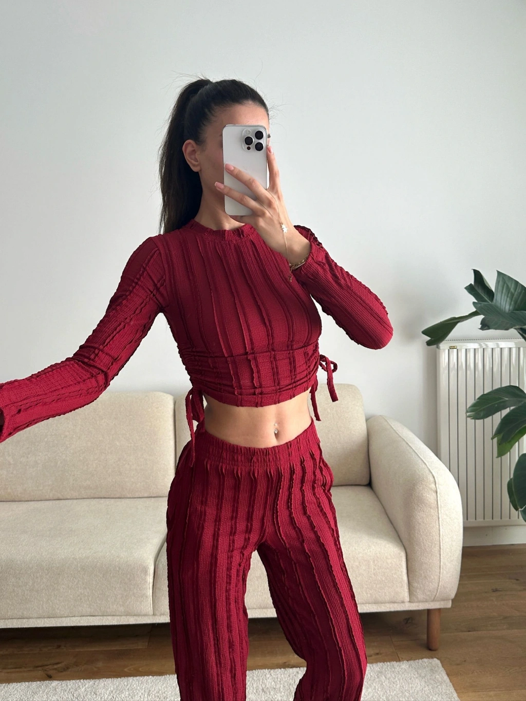 Yan Büzgü Crop & Pantolon Takım - BORDO