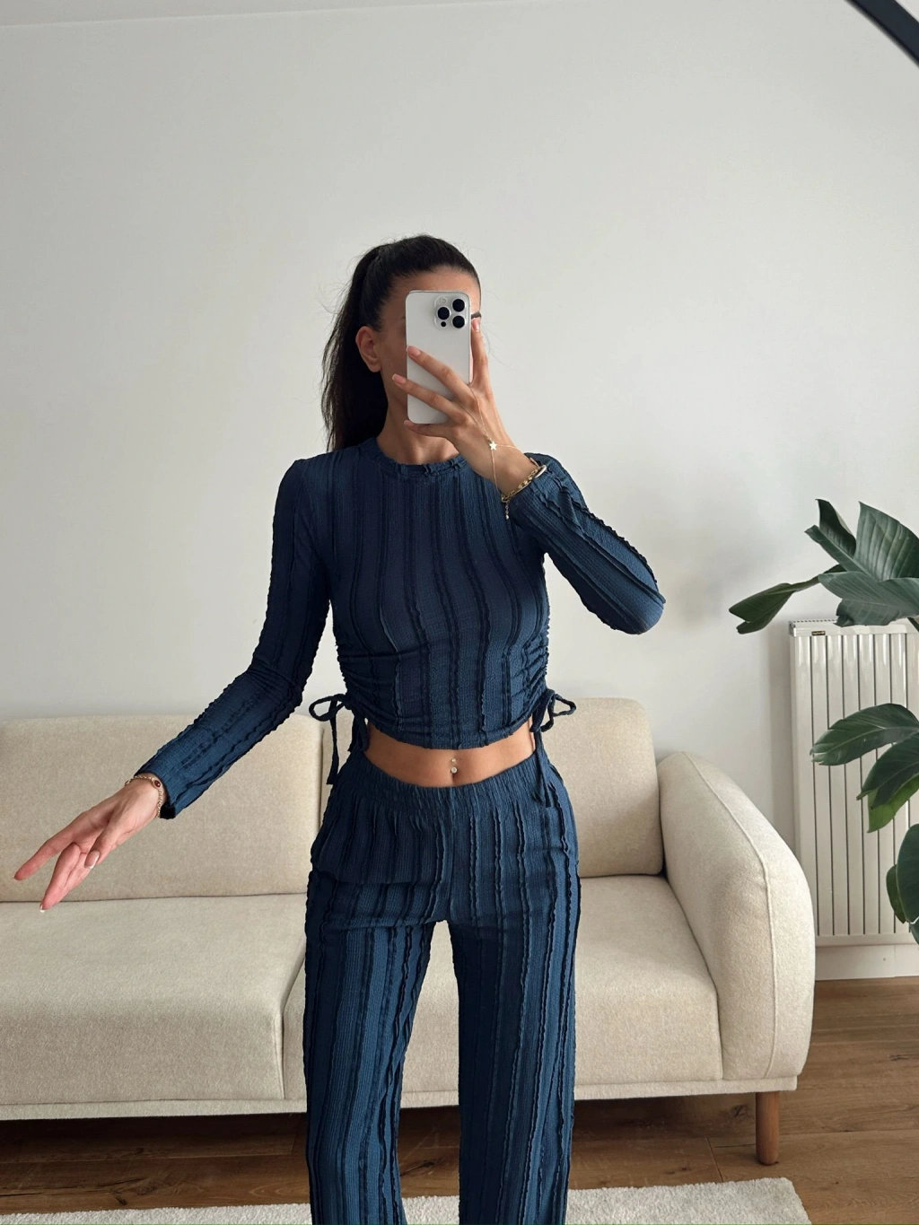 Yan Büzgü Crop & Pantolon Takım - LACİVERT