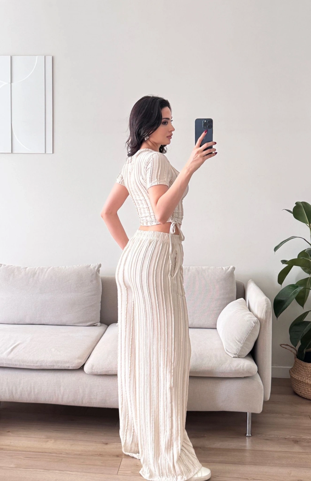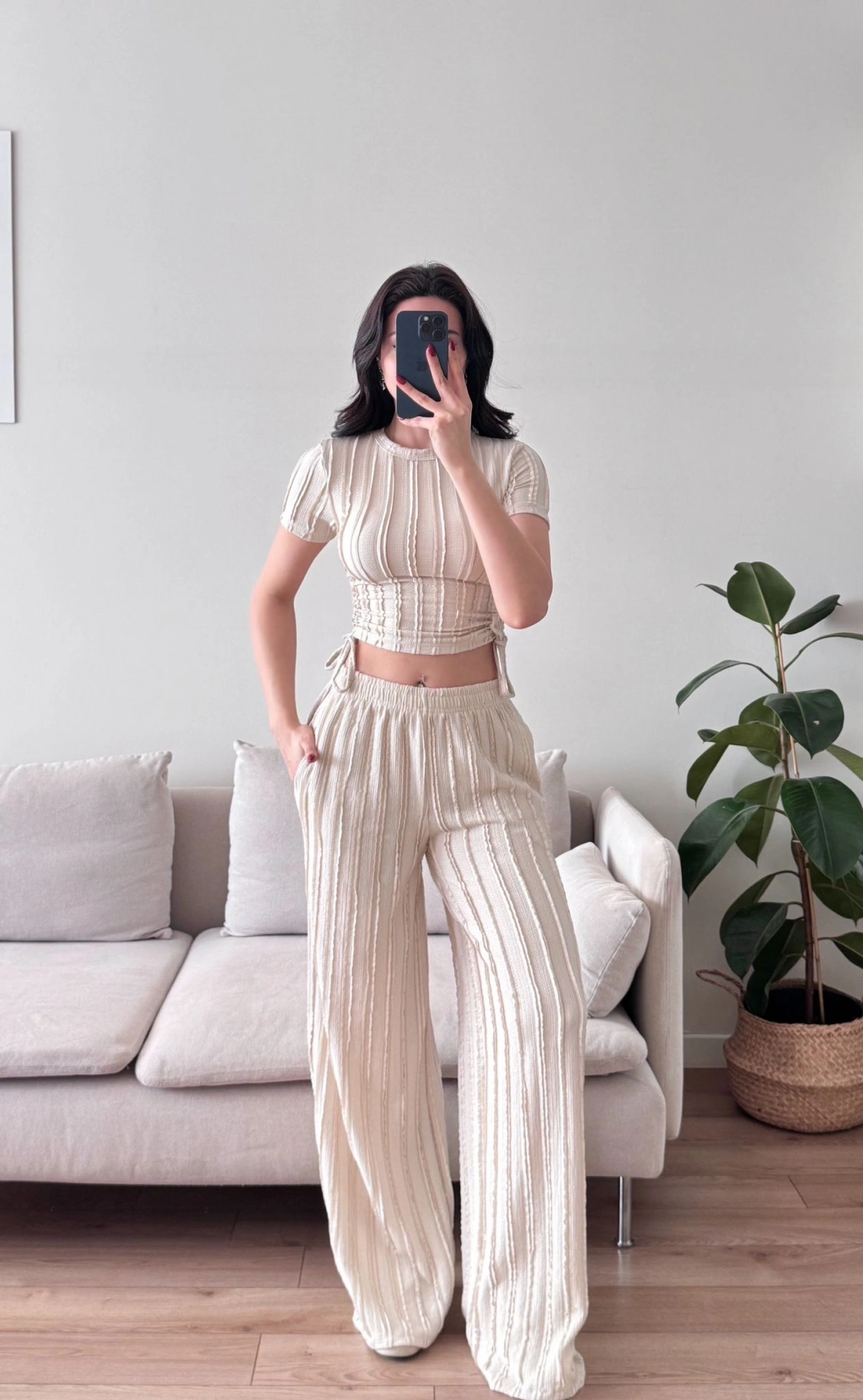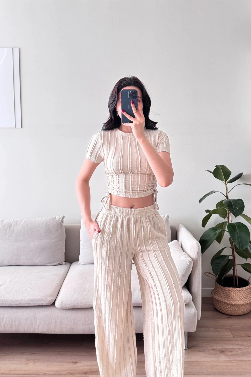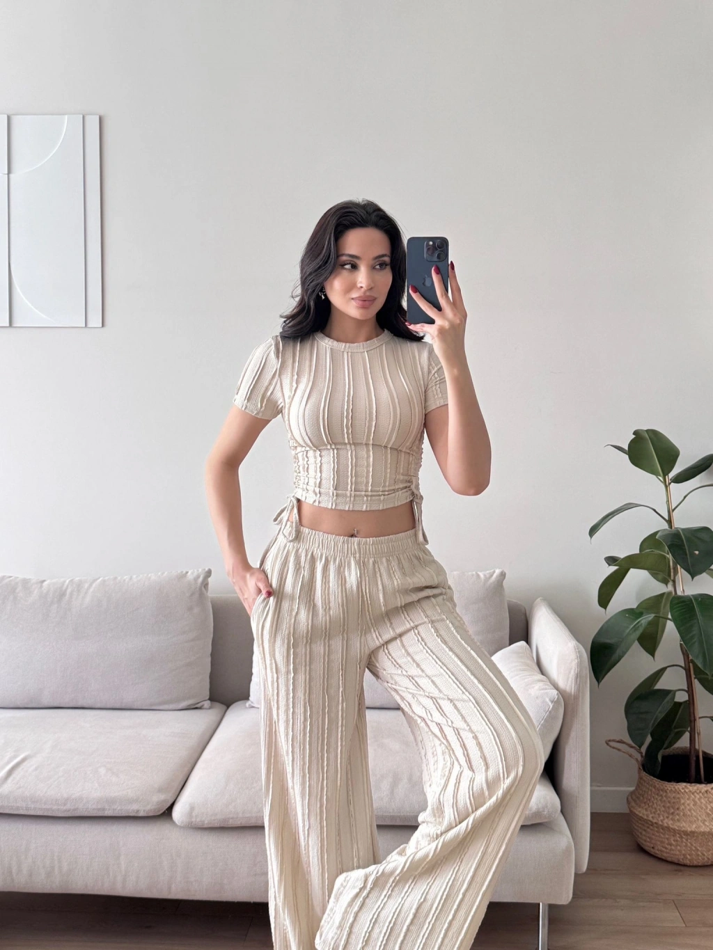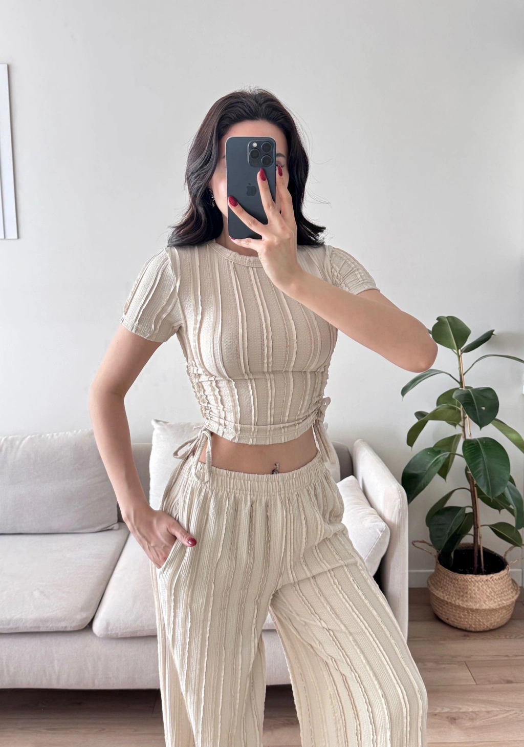 Yan Büzgü Pantolon Takım - BEJ