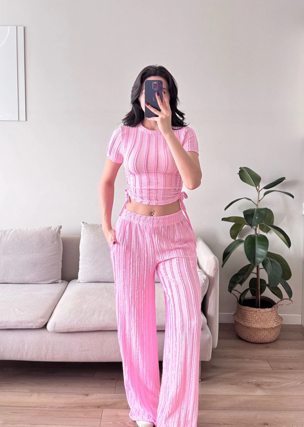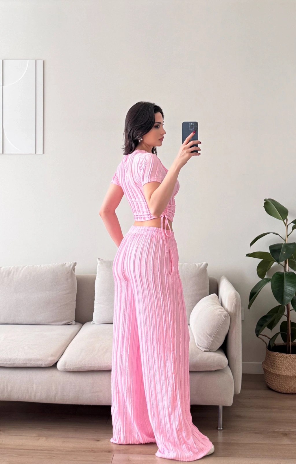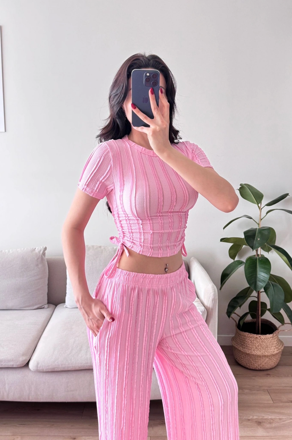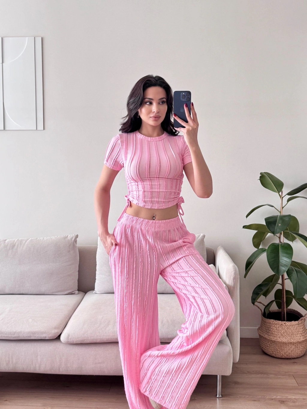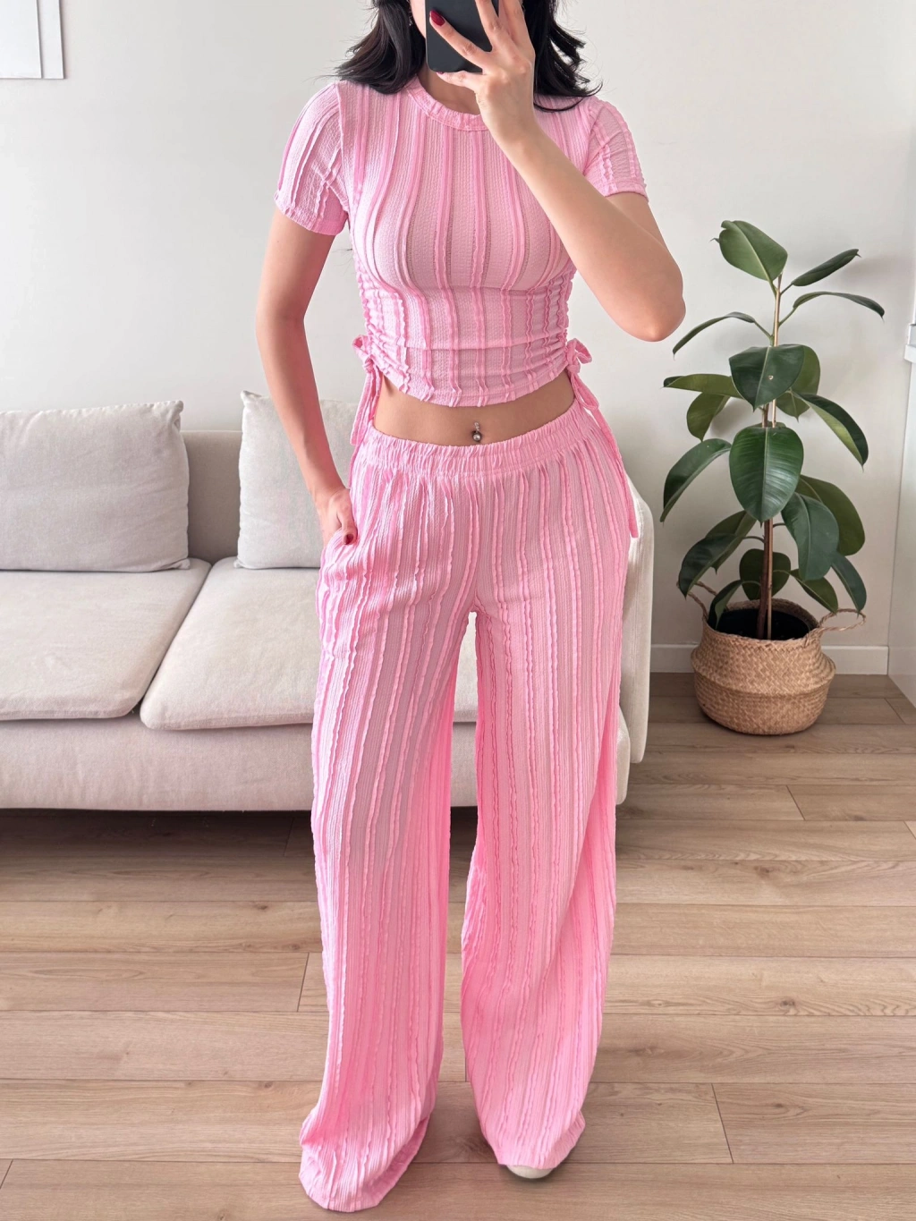 Yan Büzgü Pantolon Takım - PEMBE