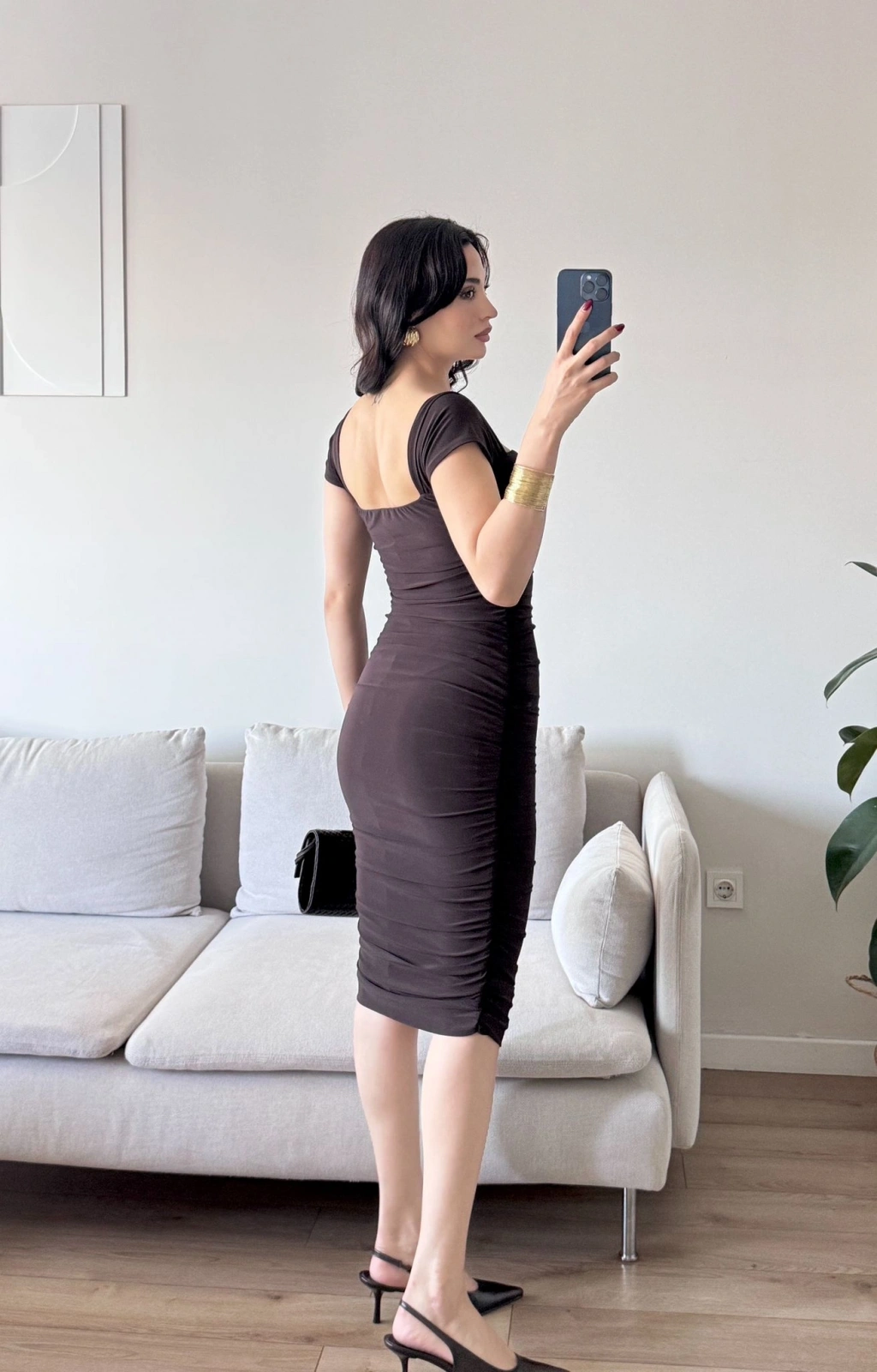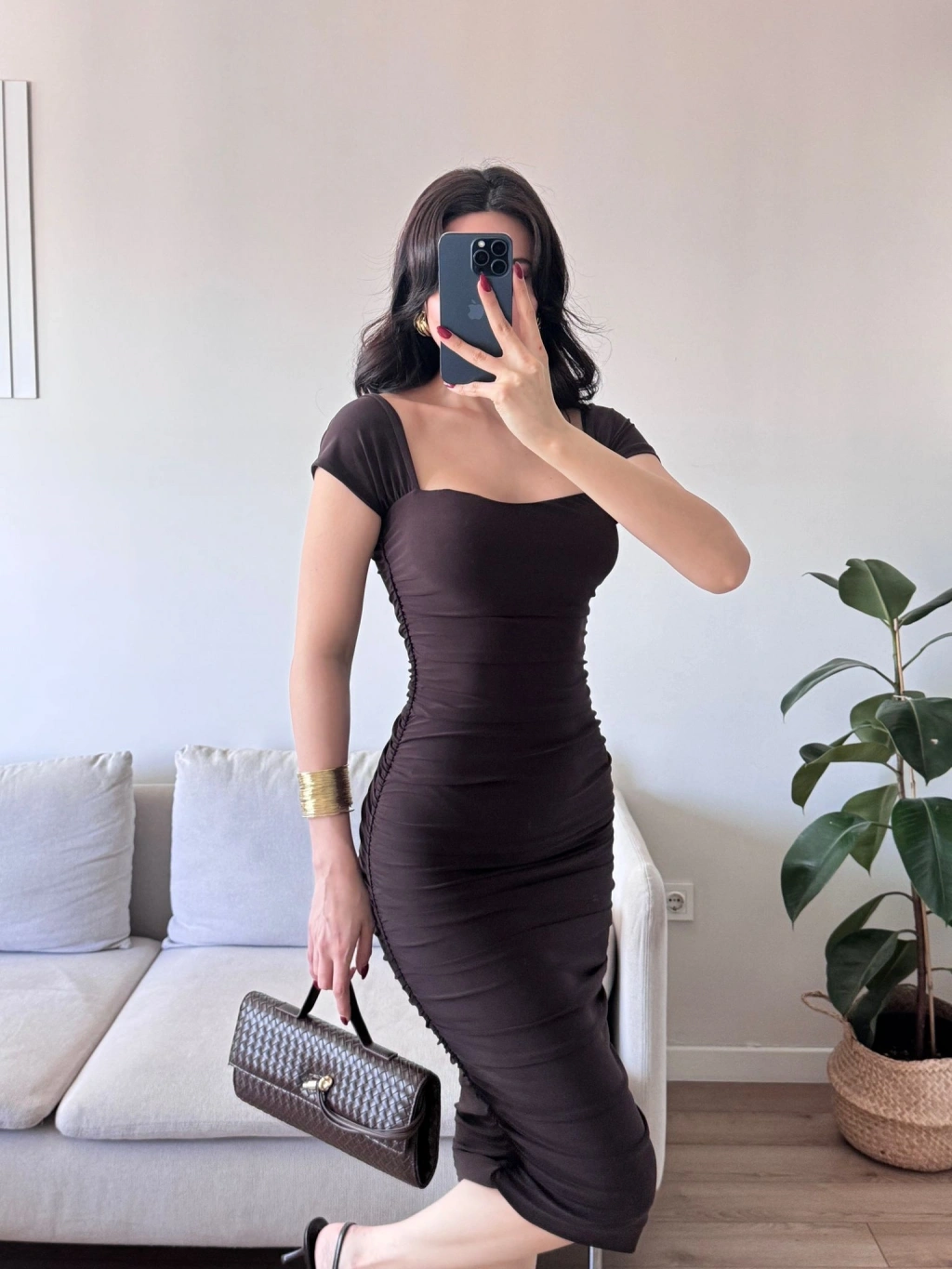Yan Büzgülü Madona Elbise - KAHVE