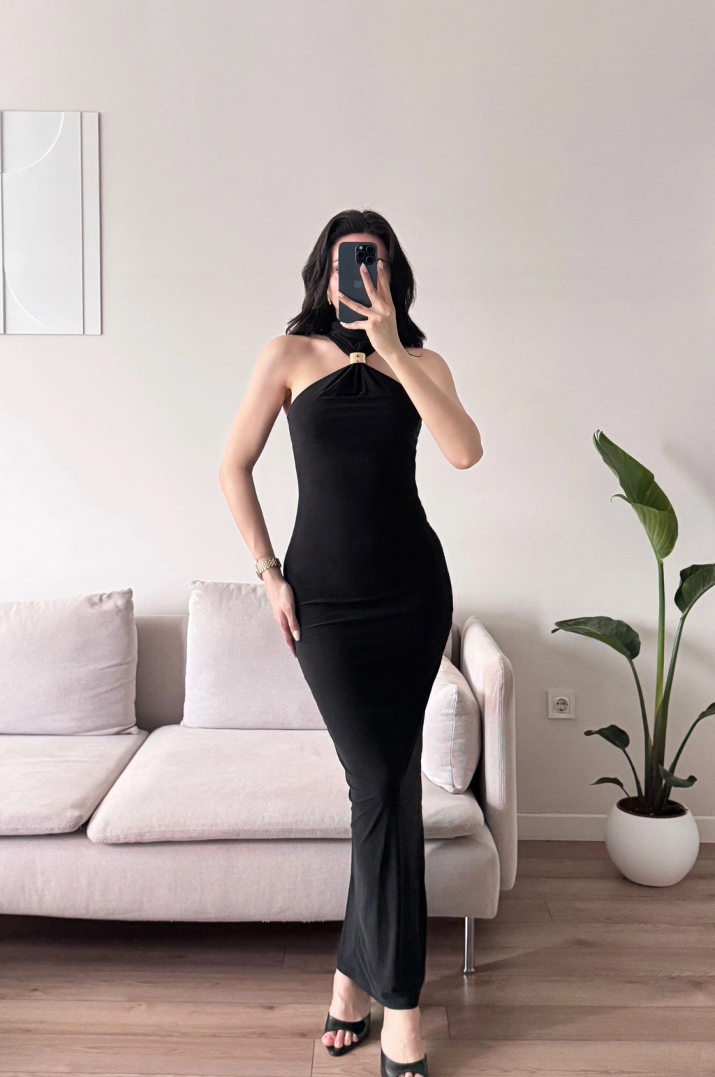 Yırtmaç Detay Aksesuarlı Elbise - SİYAH