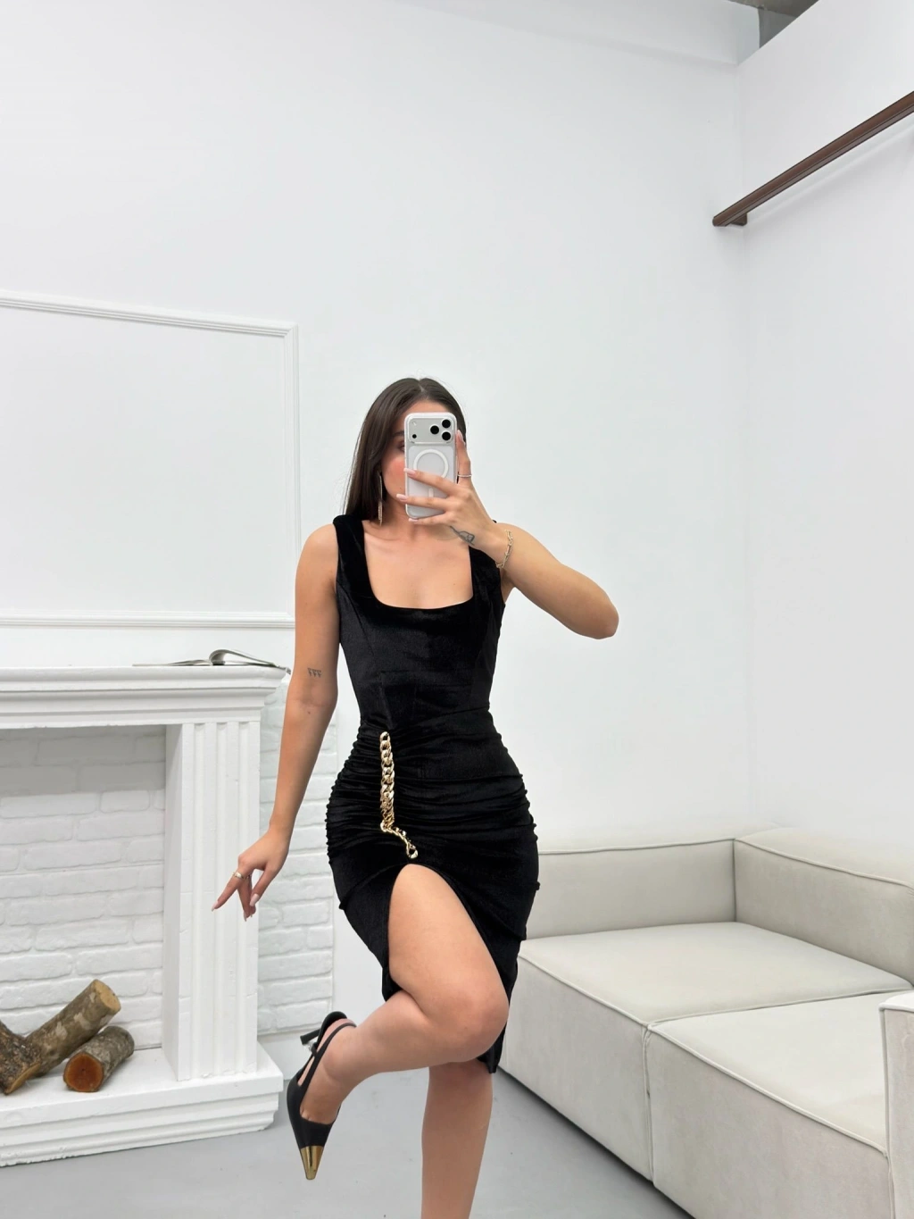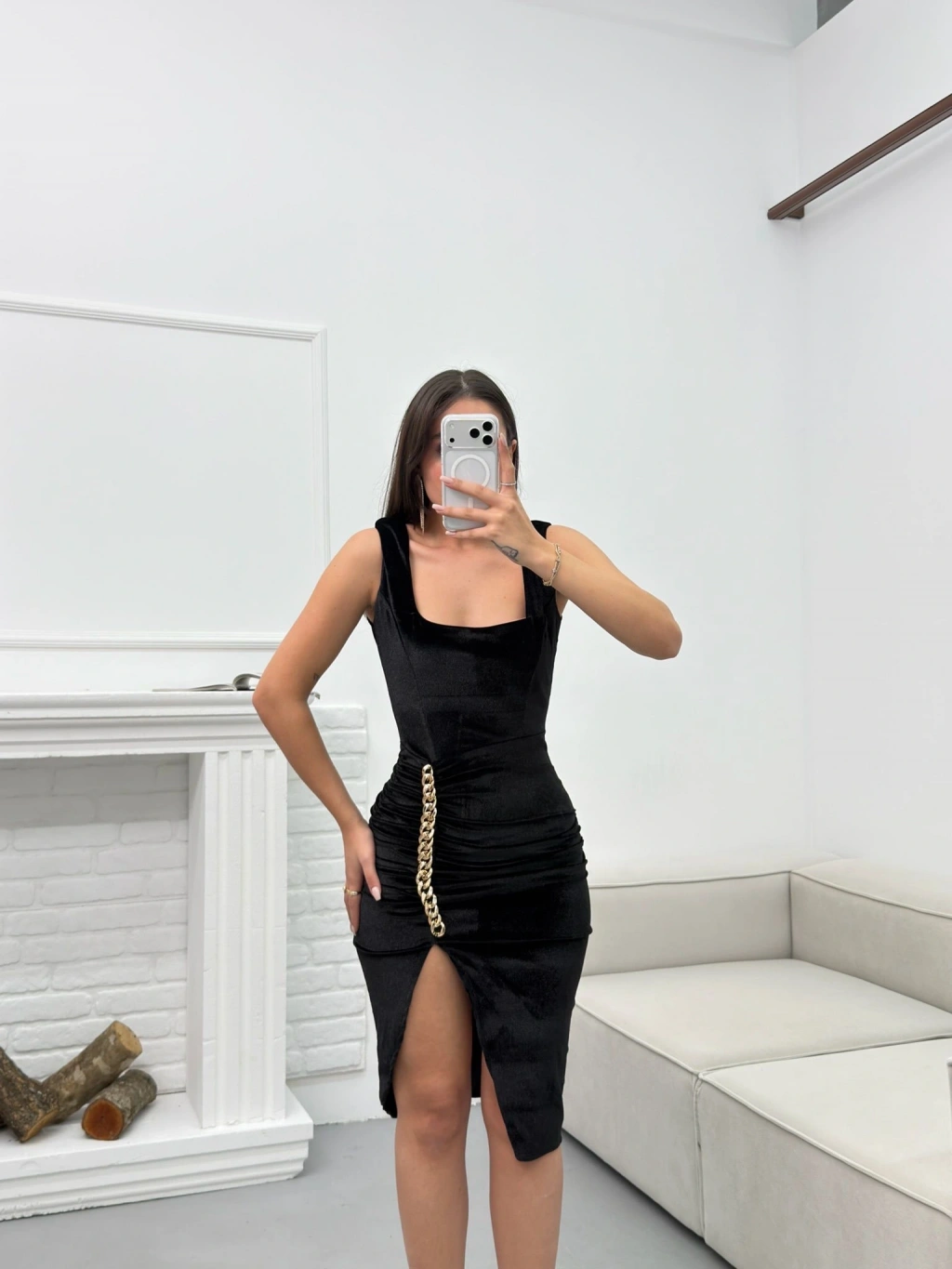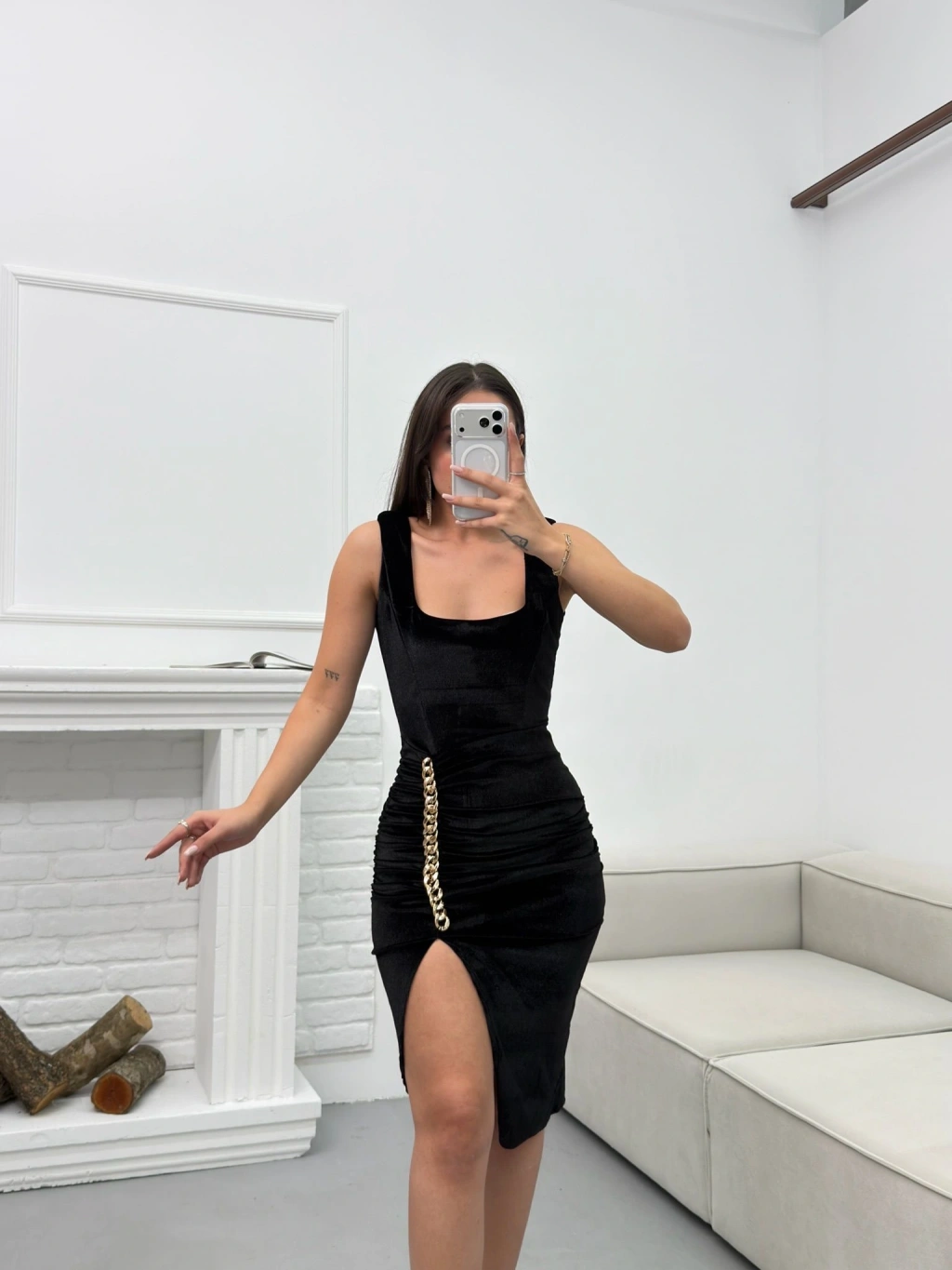Zincir Aksesuar Kare Yaka Elbise - SİYAH