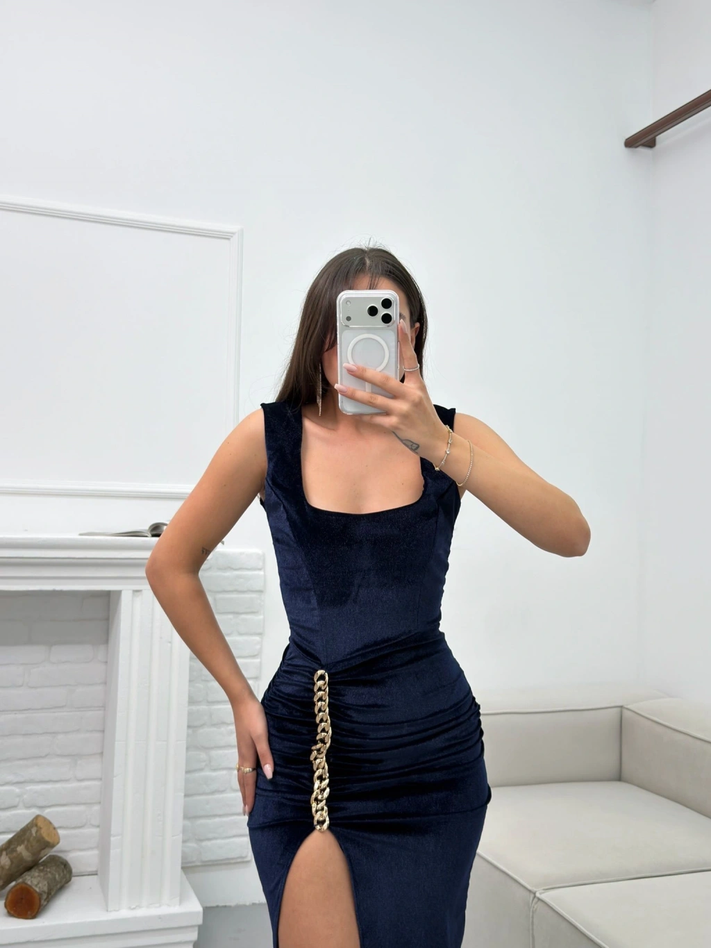 Zincir Aksesuar Kare Yaka Elbise - LACİVERT
